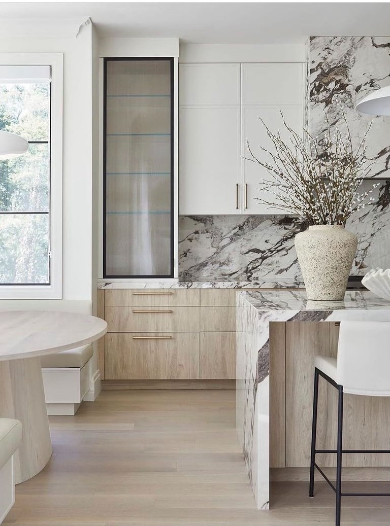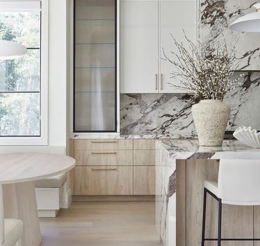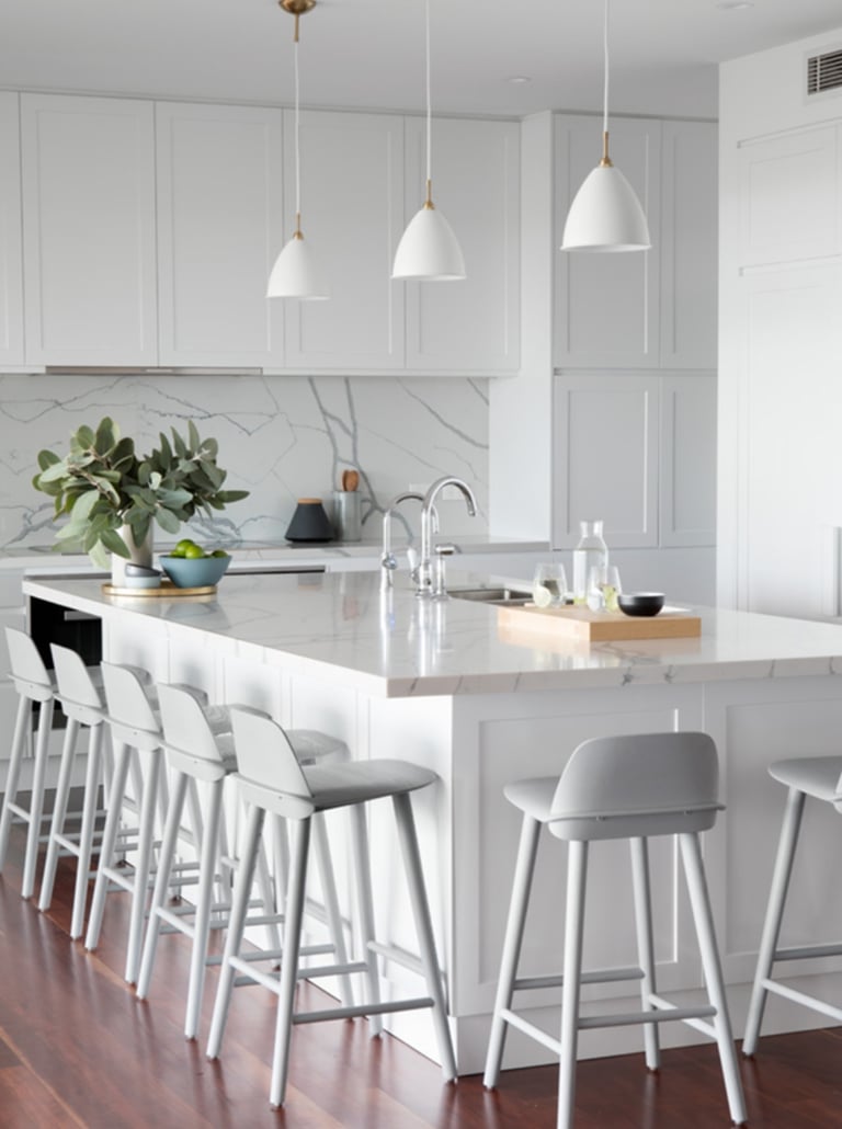 The contemporary kitchen is increasingly reflecting the homeowner's personality and lifestyle. Think customised cabinetry profiles and colours, unique backsplash designs with the use of highly patterned stones and and statement lighting fixtures. These features marry design and performance to create a highly aesthetic kitchen that reflects the style of the home and personality of the owners.